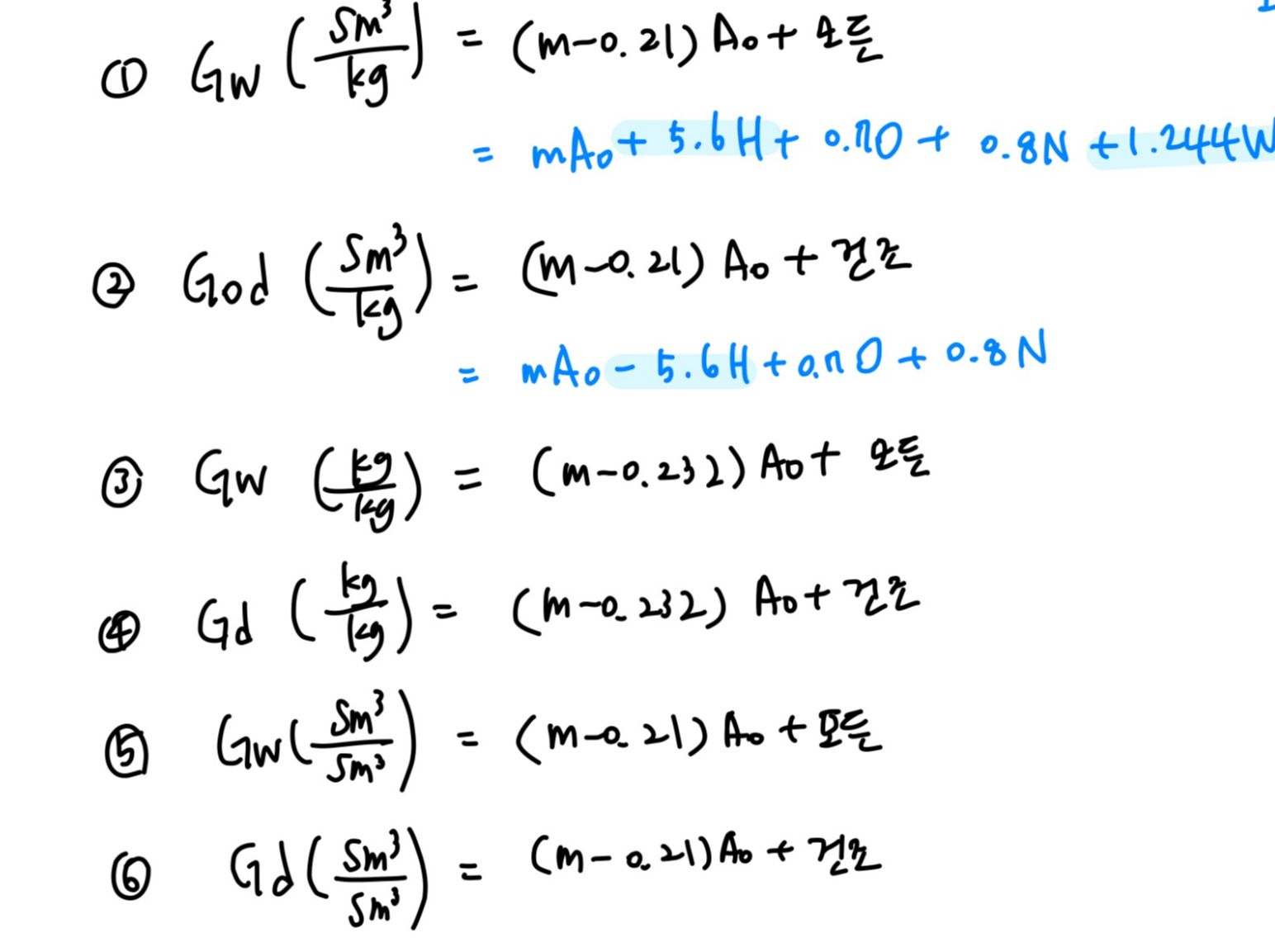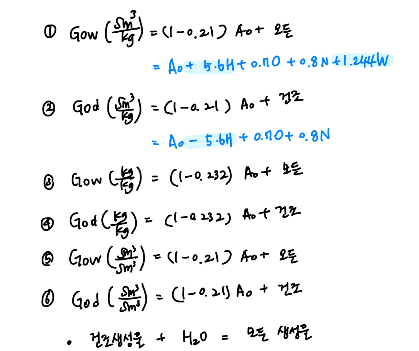 ※ 여기서 , G : 가스량(S㎥)으로서 모든 가스량(Gow, God, Gw, Gd)으로 표현가능하기 때문에 반드시 문제의 조건에서 찾아야함.